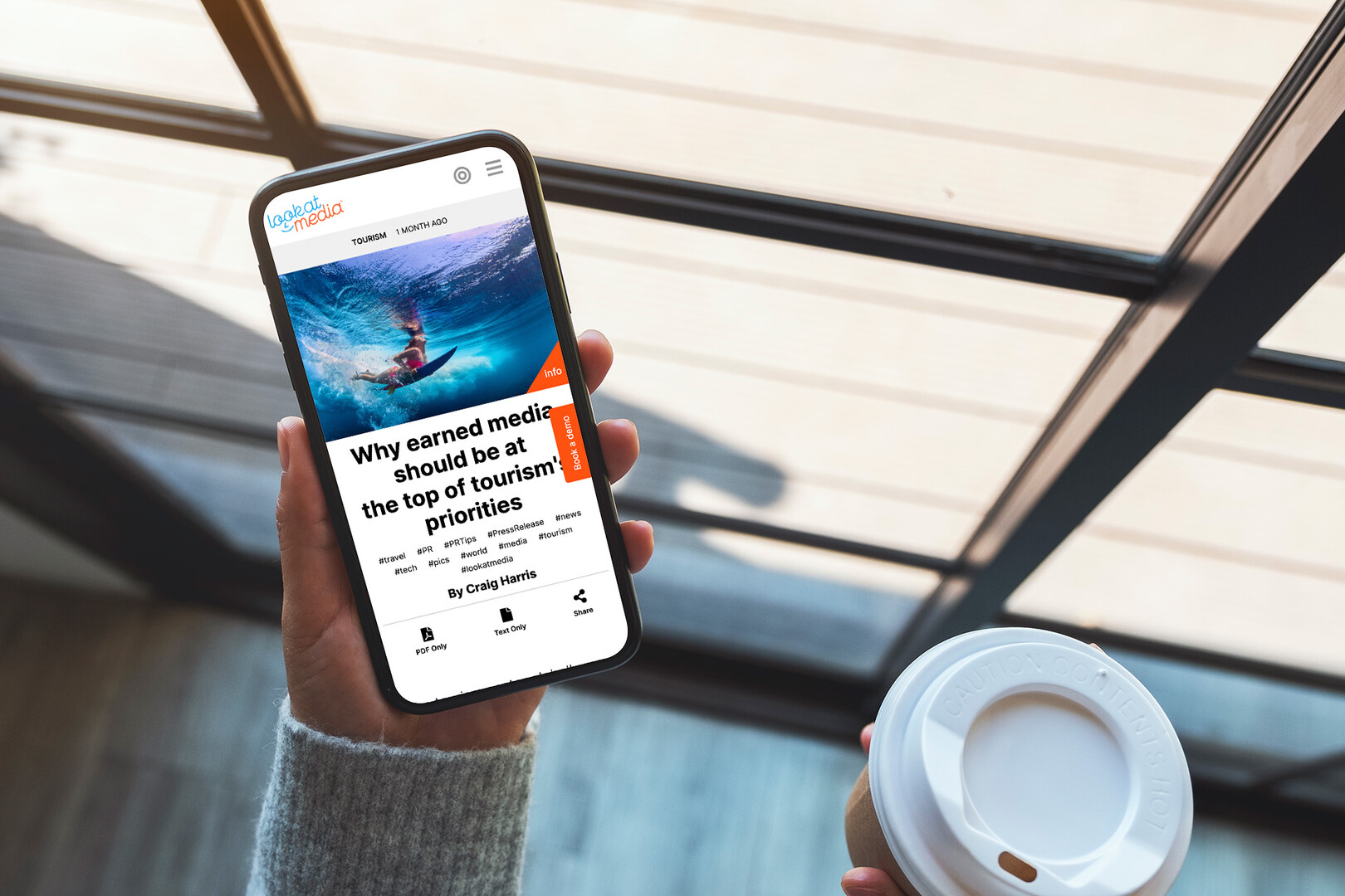 A person holds a smartphone displaying a webpage featuring a surfing image, while the other hand grips a coffee cup. The setting appears to be indoors, with large windows allowing natural light to illuminate the scene, suggesting a modern cafe enviro