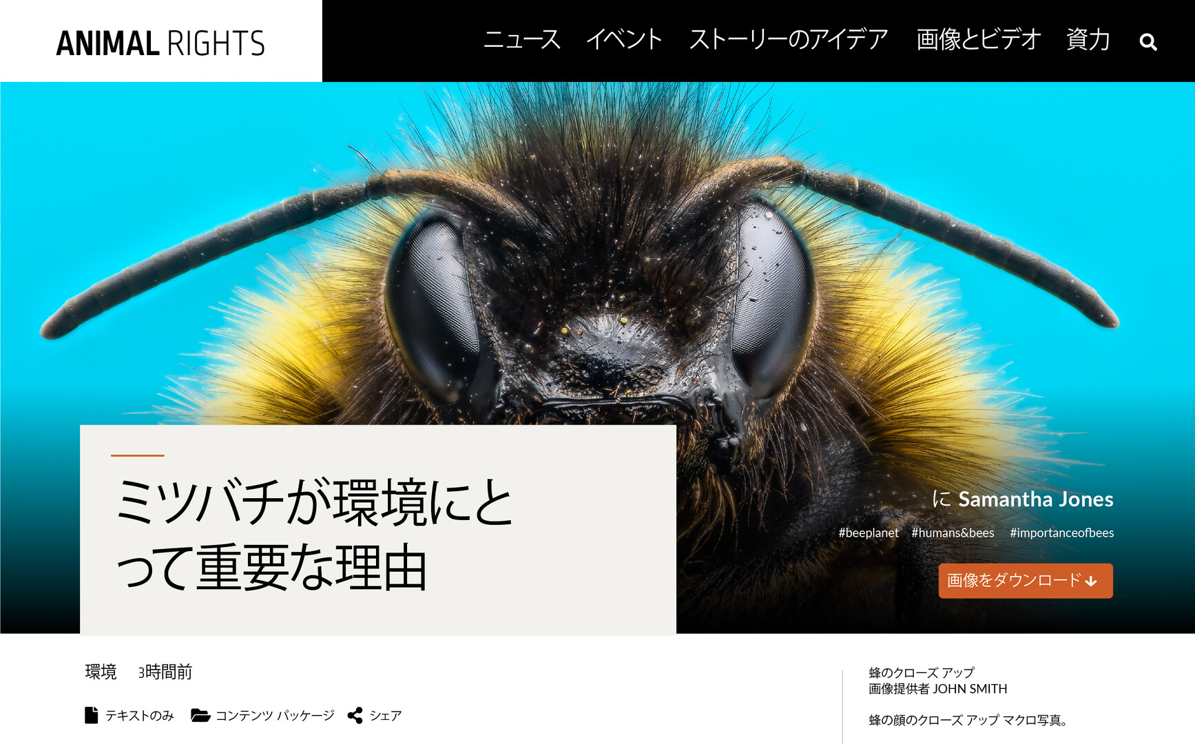 A close-up image of a bee highlights its distinct features, including hairy legs and large eyes. The background displays a bright, colorful garden setting, suggesting a natural environment. The text on the webpage mentions "ミツバチが環境にとって重要な理由," emphasi