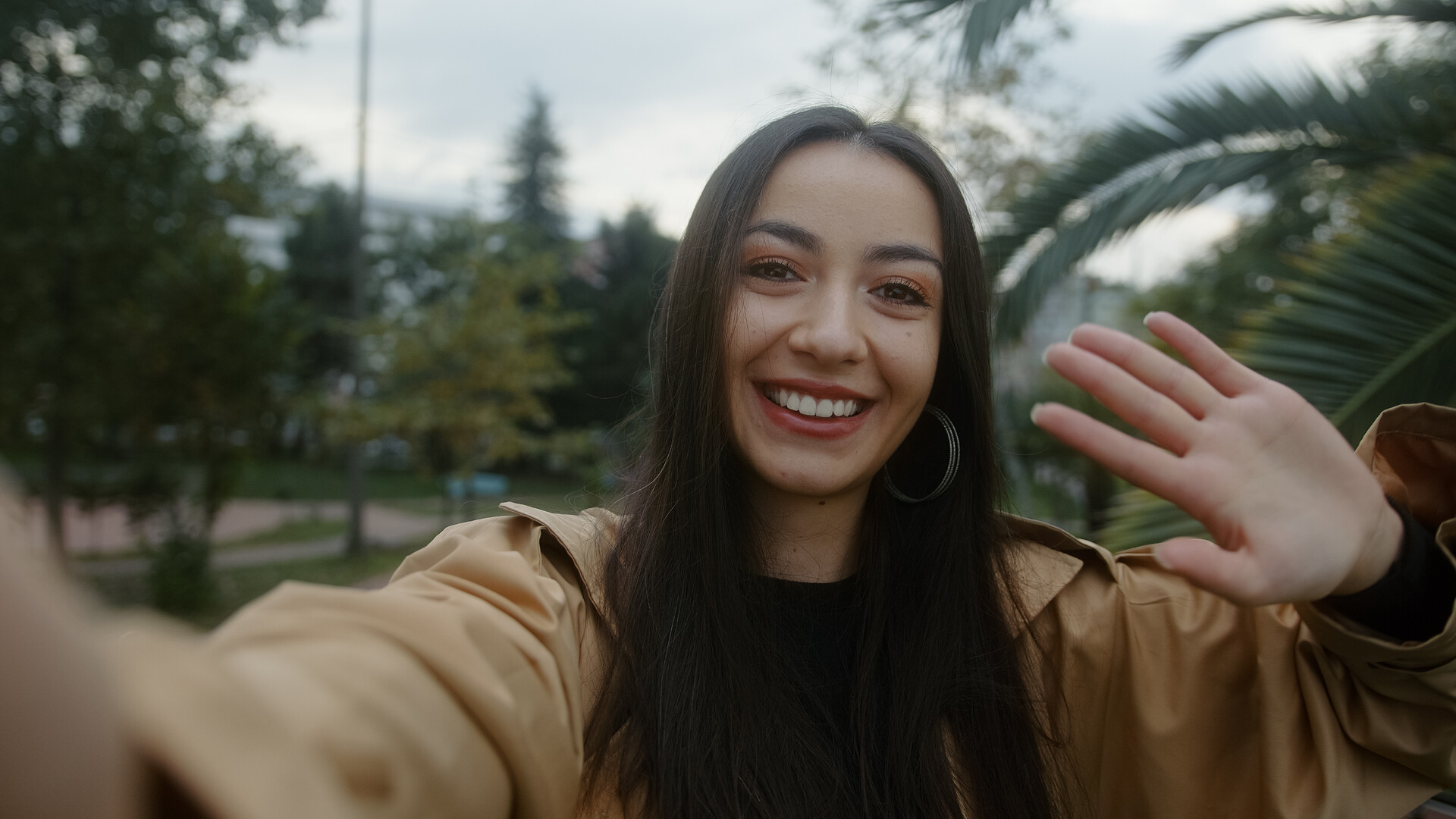 Beautiful young smiling face woman holding camera or phone in hand and she makes video call or she is recording video for her fans, she is surprised suddenly, video call and vlogger concept