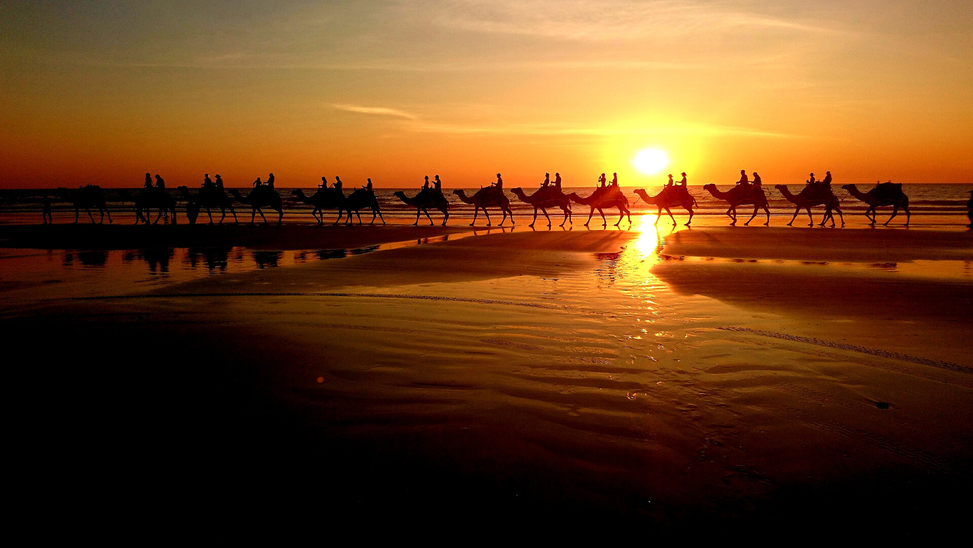 A line of camels walks along a beach at sunset, with the sun setting low on the horizon and casting reflections on the wet sand. The silhouettes of the riders atop the camels are visible against the vibrant sky, creating a serene and picturesque scen