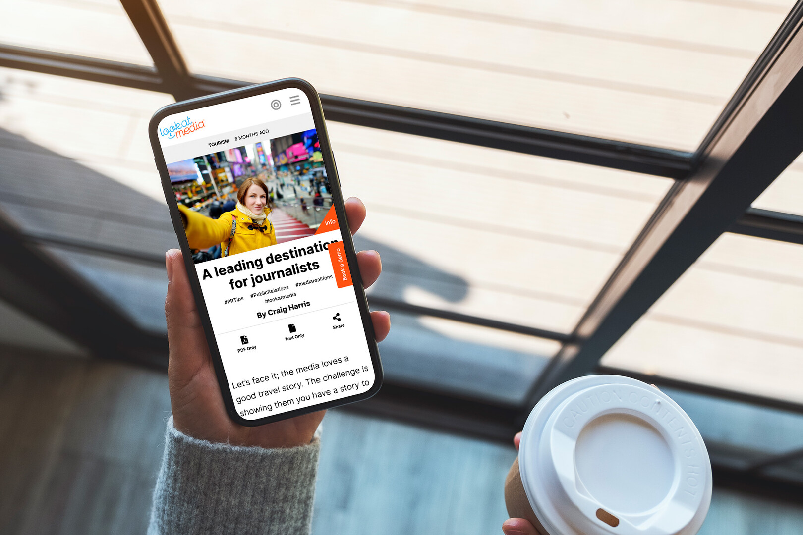 A person holds a smartphone displaying an article about journalism, featuring an image of a woman posing in a city environment, possibly Times Square. A coffee cup rests on a table beside them. The setting appears to be a modern café with large windo