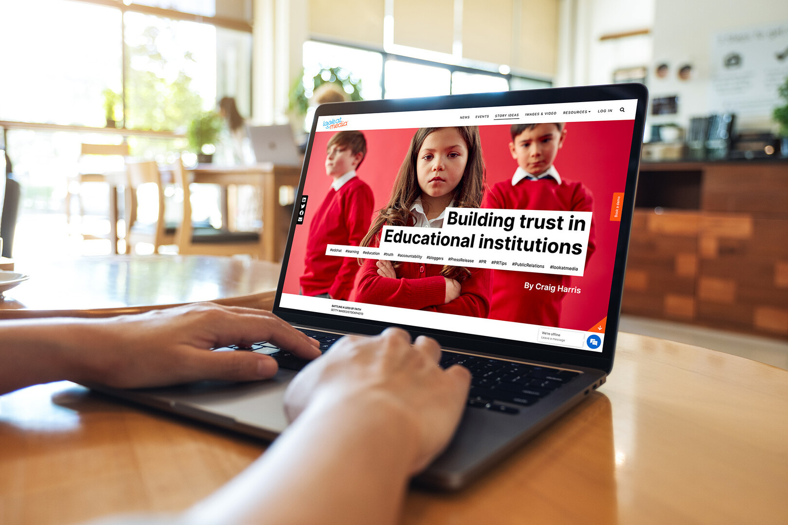 A person is using a laptop at a table in a café. The screen displays an article titled "Building trust in Educational institutions" with a photograph of two children in red clothing. The café features large windows allowing natural light and has a wo