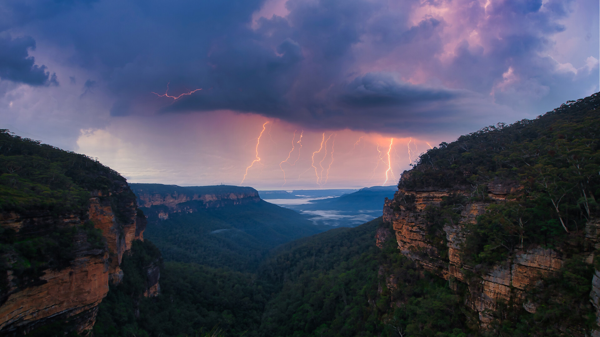 Lightning strikes illuminate a dark sky over a valley surrounded by steep cliffs, with dense green foliage visible along the slopes. The scene depicts a dramatic weather event, likely in a rural or mountainous region, as storm clouds gather overhead